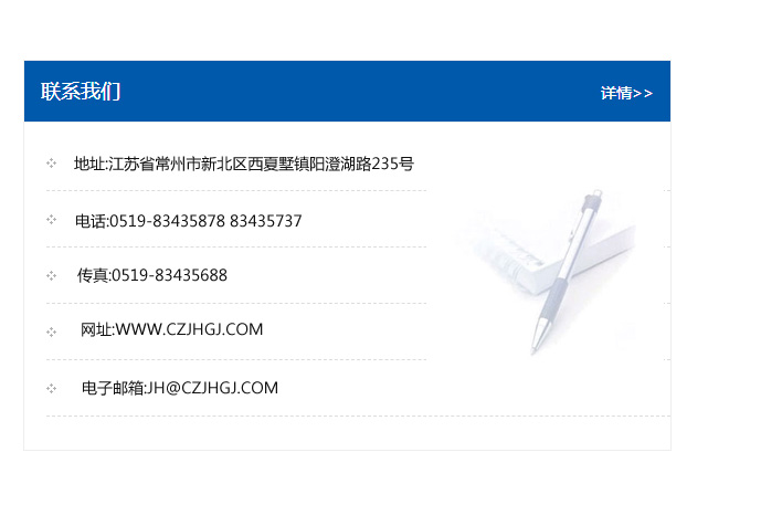 地址:常州市新北區友邦商務大廈1幢16、17層  電話:0519-85101652  傳真:0519-85112595  郵編:213022  網址:www_cz-jiayue_cn.qhhdjtw.com  郵箱:xiajifengaa@163.com